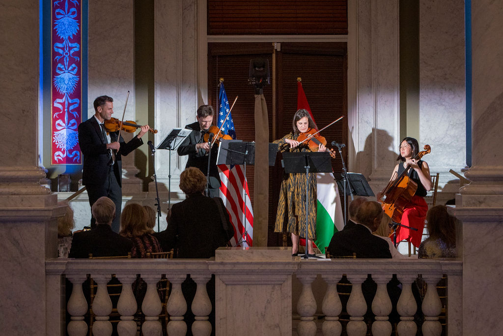 After an outstanding meal served with Hungarians wines from the Nimrod Kovacs, Buena Vista, and Sauska Wineries, guests were treated to a Hungarian-themed musical performance by Daniel Sender and the Ragged Mountain String Quartet. This cultural program was presented with support from the New York-based Tulipán Foundation, and introduced by Foundation leaders Monika Krausz and Ildikó Nagy. The ensemble brought together internationally recognized musicians: violinist Daniel Sender, concertmaster of the Charlottesville Symphony and Charlottesville Opera; violinist and conductor Benjamin Rous; violist Danielle Wiebe Burke; and cellist Clara Lee Rous.